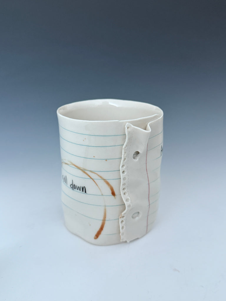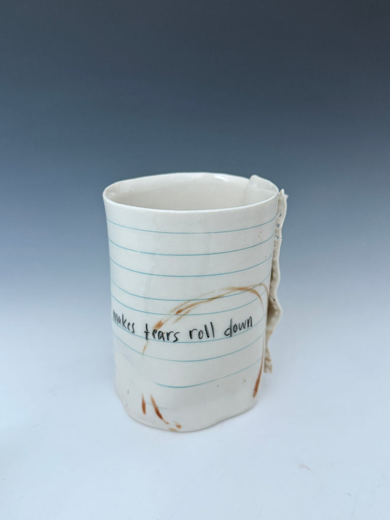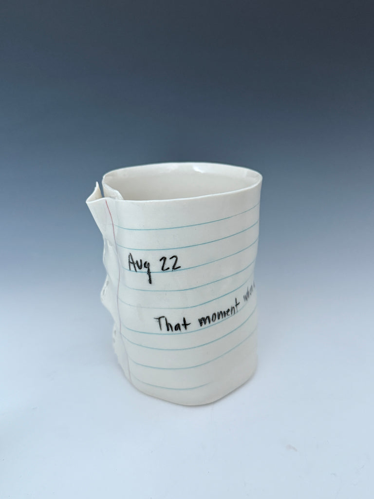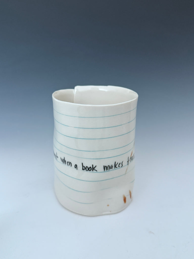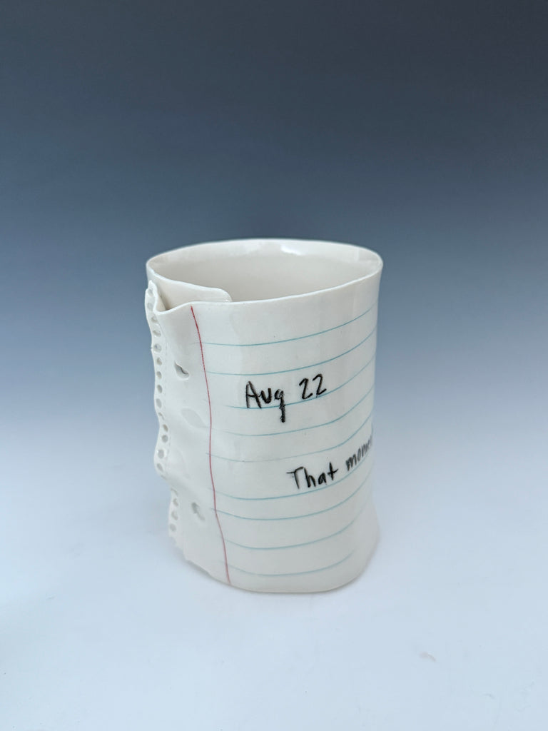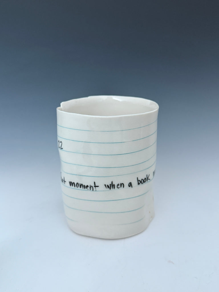 I manipulate porcelain to mimic college ruled notebook paper. On the thinnest pieces, the porcelain becomes translucent showing light and the text through the vessel :) I hope you enjoy the familiarity of the spacing of the blue and red lines and binder holes, and giggle a bit at the reminder of the frustration of that inevitable frayed edge. :)