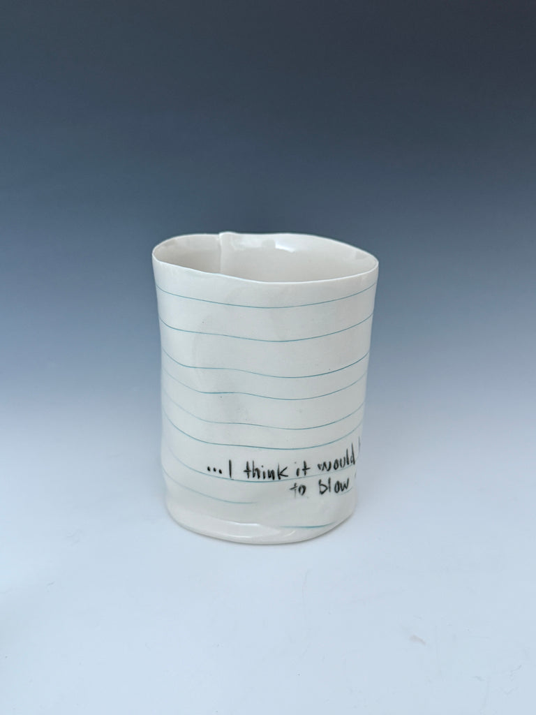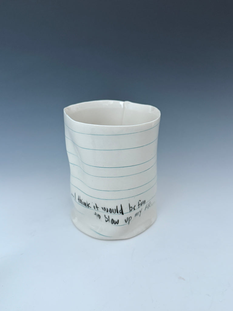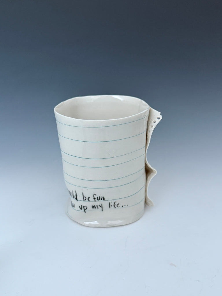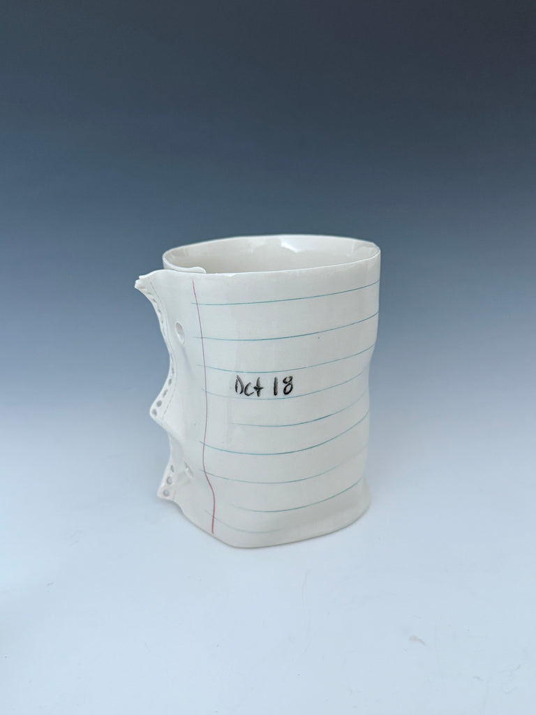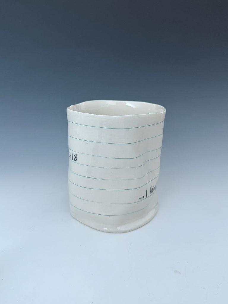 I manipulate porcelain to mimic college ruled notebook paper. On the thinnest pieces, the porcelain becomes translucent showing light and the text through the vessel :) I hope you enjoy the familiarity of the spacing of the blue and red lines and binder holes, and giggle a bit at the reminder of the frustration of that inevitable frayed edge. :)