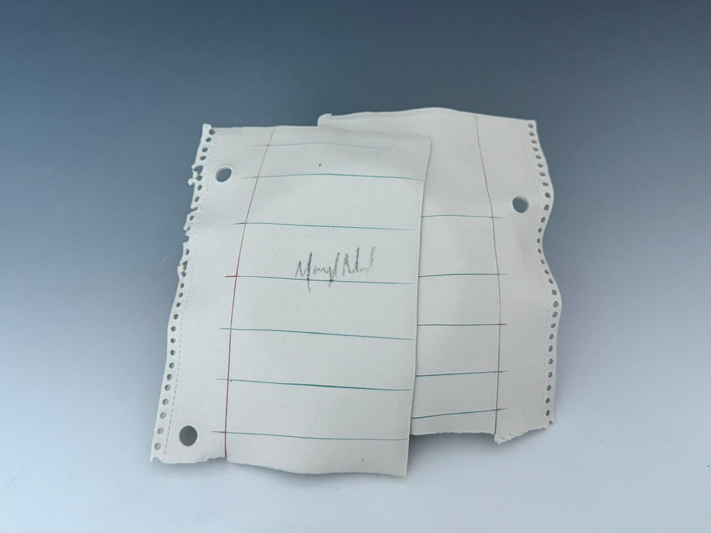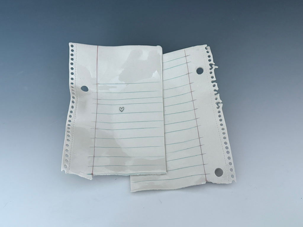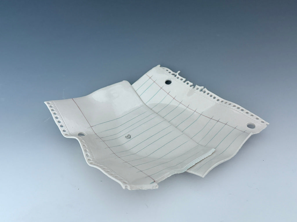 I manipulate porcelain to mimic college ruled notebook paper. On the thinnest pieces, the porcelain becomes translucent showing light and the text through the vessel :) I hope you enjoy the familiarity of the spacing of the blue and red lines and binder holes, and giggle a bit at the reminder of the frustration of that inevitable frayed edge. :)