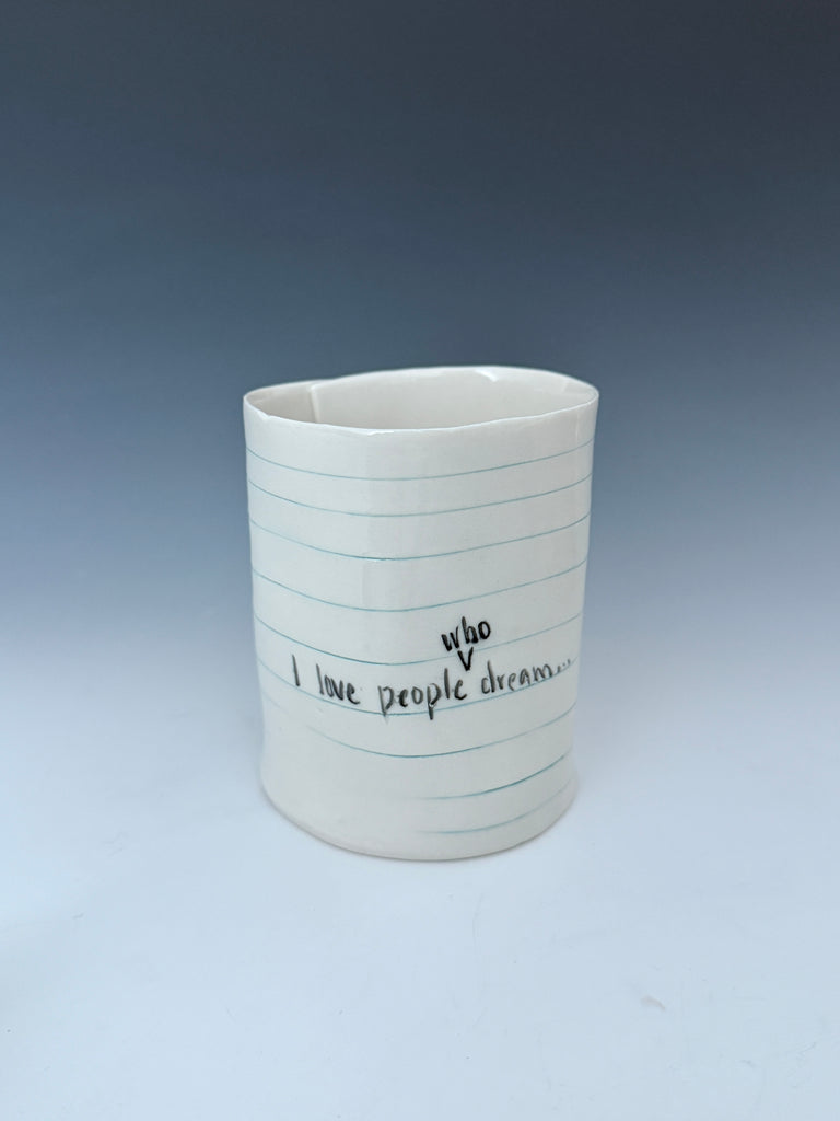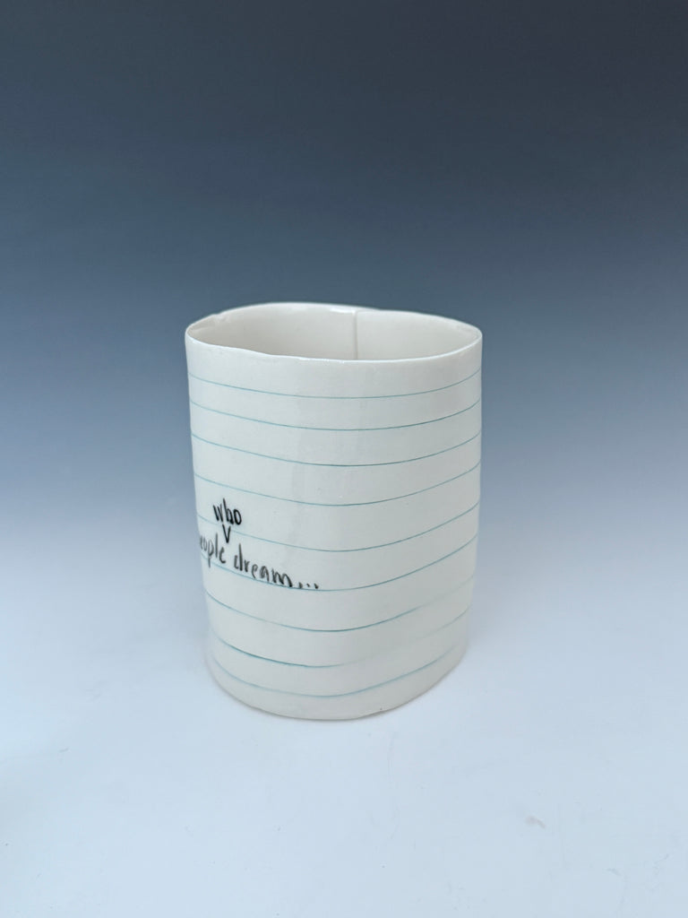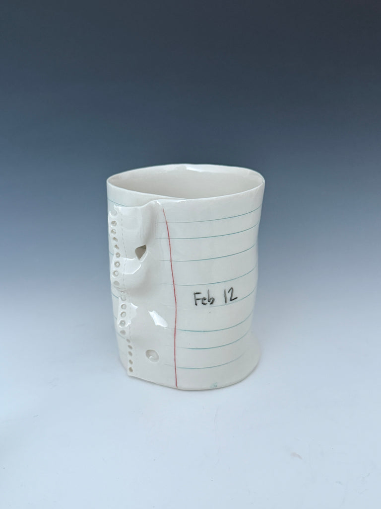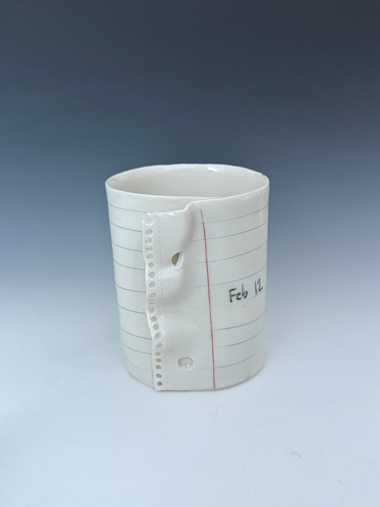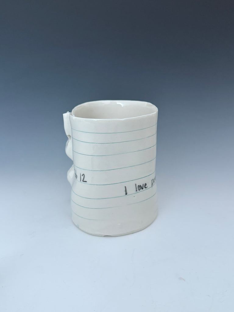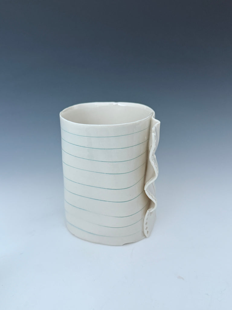 I manipulate porcelain to mimic college ruled notebook paper. On the thinnest pieces, the porcelain becomes translucent showing light and the text through the vessel :) I hope you enjoy the familiarity of the spacing of the blue and red lines and binder holes, and giggle a bit at the reminder of the frustration of that inevitable frayed edge. :)