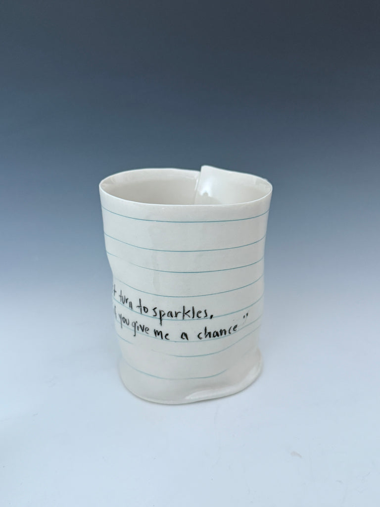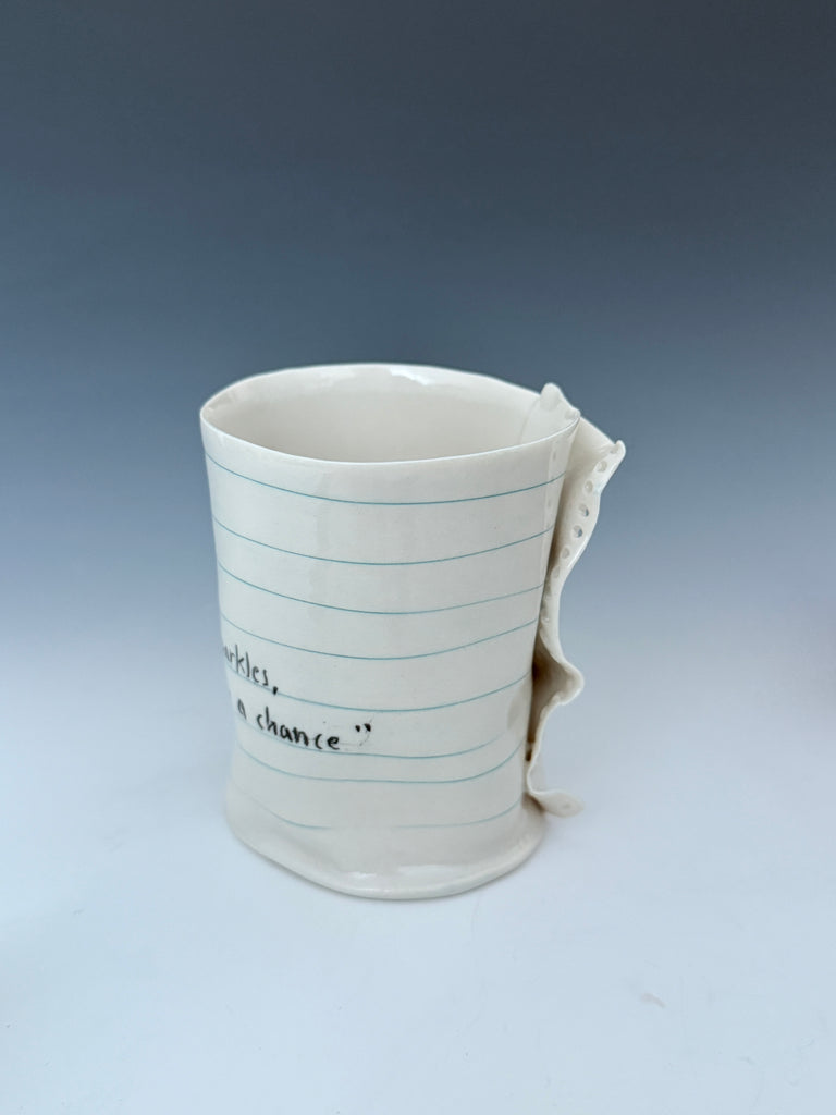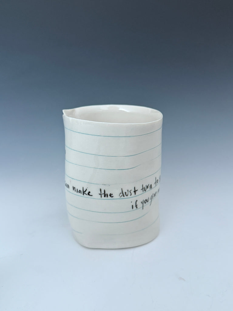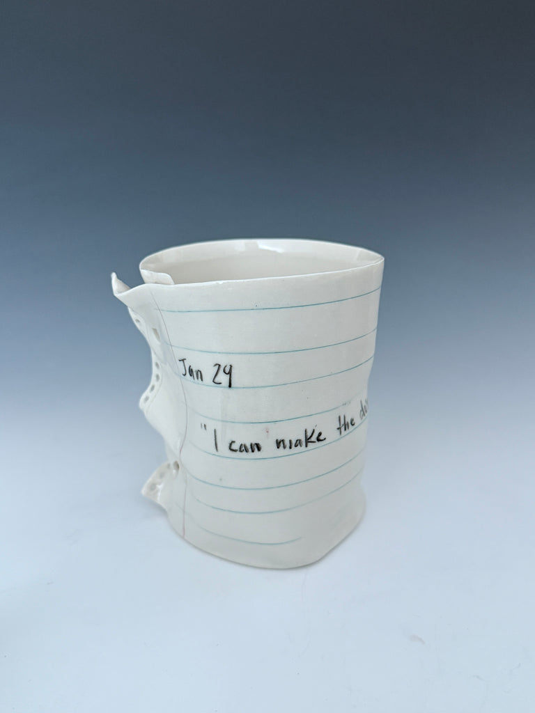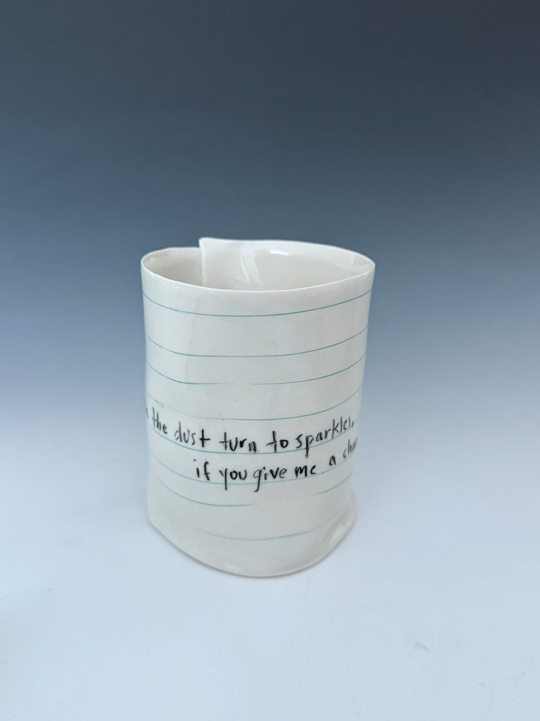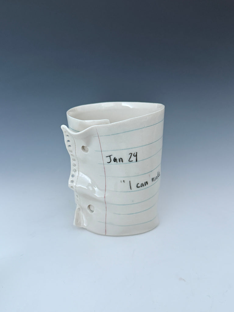 I manipulate porcelain to mimic college ruled notebook paper. On the thinnest pieces, the porcelain becomes translucent showing light and the text through the vessel :) I hope you enjoy the familiarity of the spacing of the blue and red lines and binder holes, and giggle a bit at the reminder of the frustration of that inevitable frayed edge. :)